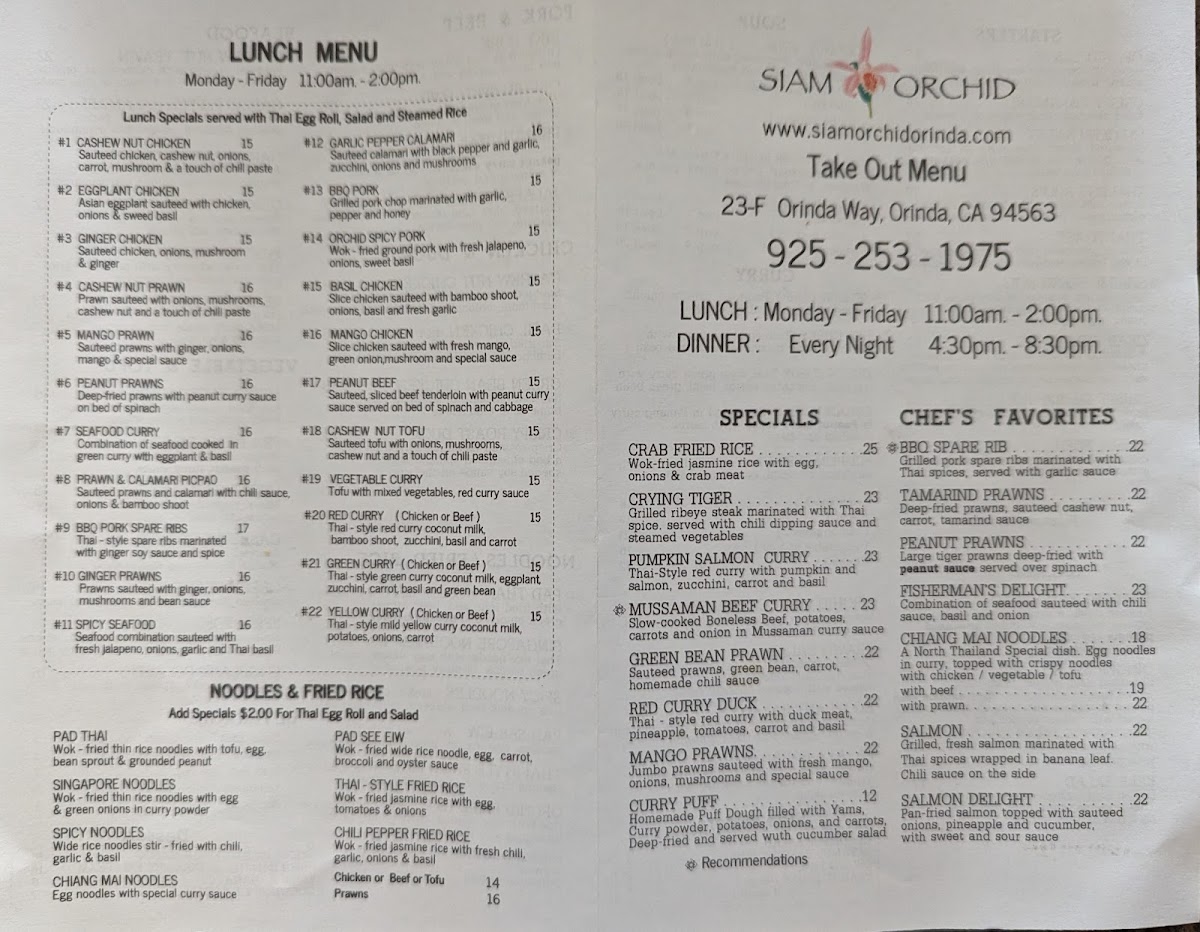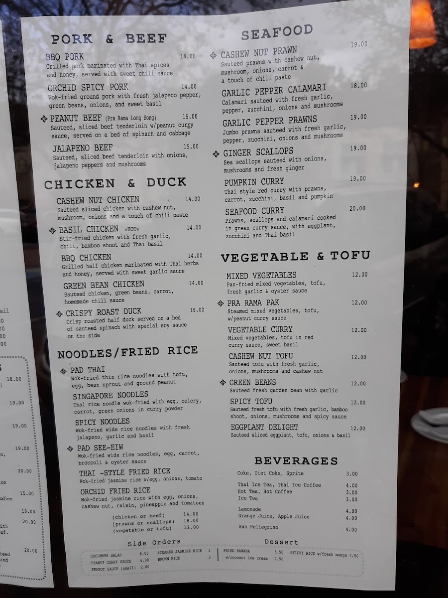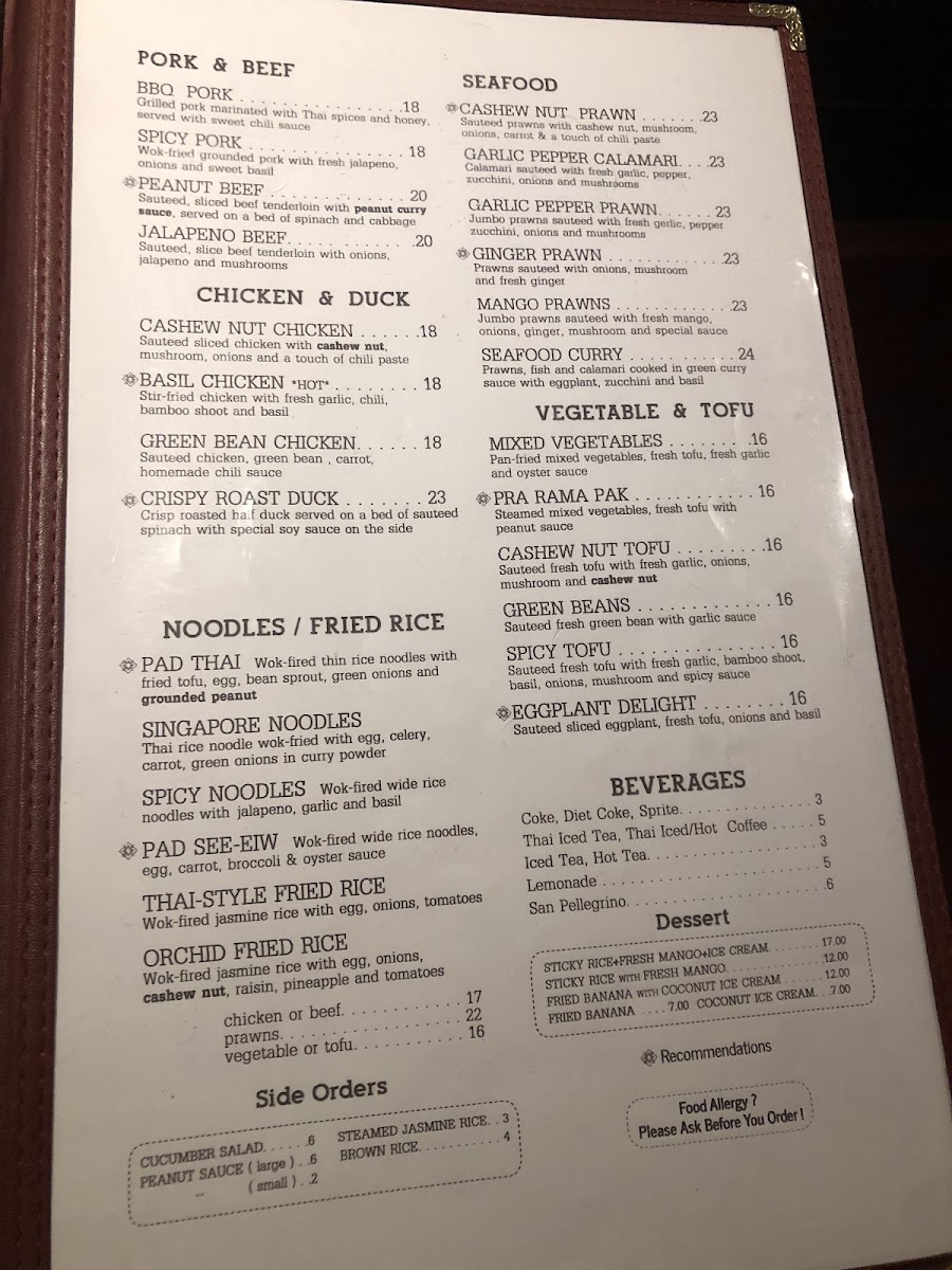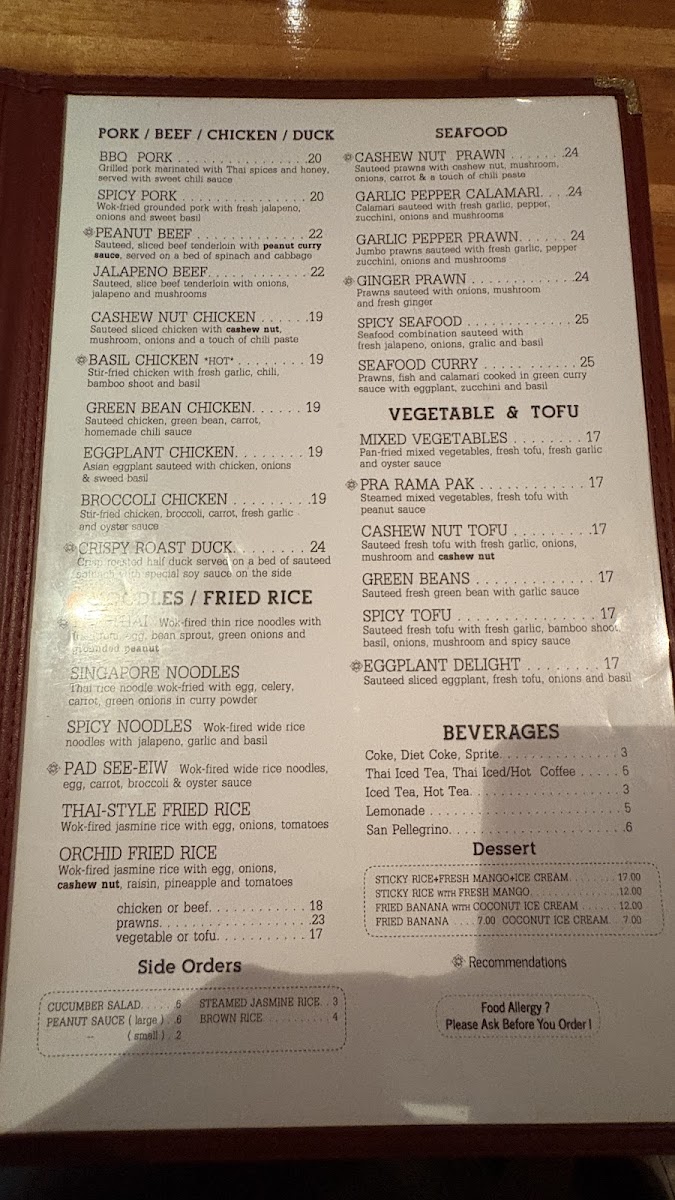 The menu at Siam Orchid Thai Restaurant offers a wide variety of traditional Thai dishes, catering to all tastes. For meat lovers, options like BBQ Pork, Spicy Pork, and Peanut Beef are available, along with unique choices like Jalapeno Beef and Cashew Nut Chicken. Seafood enthusiasts will enjoy dishes such as Cashew Nut Prawn, Garlic Pepper Calamari, and Spicy Seafood. Vegetarians can indulge in Mixed Vegetables, Pra Rama Pak, and Spicy Tofu. The fried rice and noodle selections include popular options like Thai-Style Fried Rice, Orchid Fried Rice, and Singapore Noodles. For those looking for a refreshing drink, the restaurant serves Thai Iced Tea, Lemonade, and San Pellegrino. Desserts like Sticky Rice with Fresh Mango and Fried Banana with Coconut Ice Cream offer a sweet finish to the meal. The side dishes, including Cucumber Salad and Steamed Jasmine Rice, complement the main courses. For a truly flavorful experience, diners can also explore specialties like Crying Tiger and Pumpkin Salmon Curry. With such a diverse menu, Siam Orchid provides something for everyone, making it a great choice for any occasion.