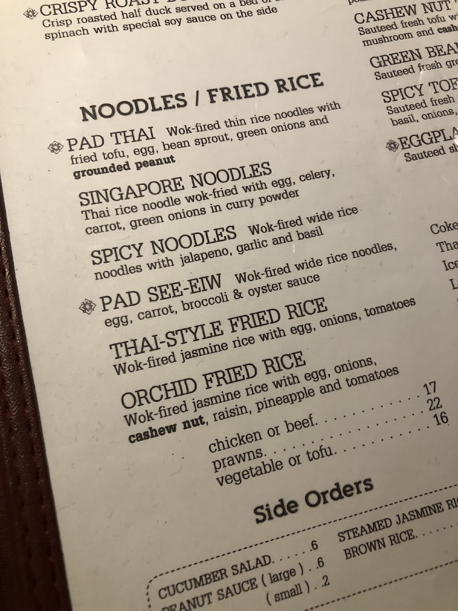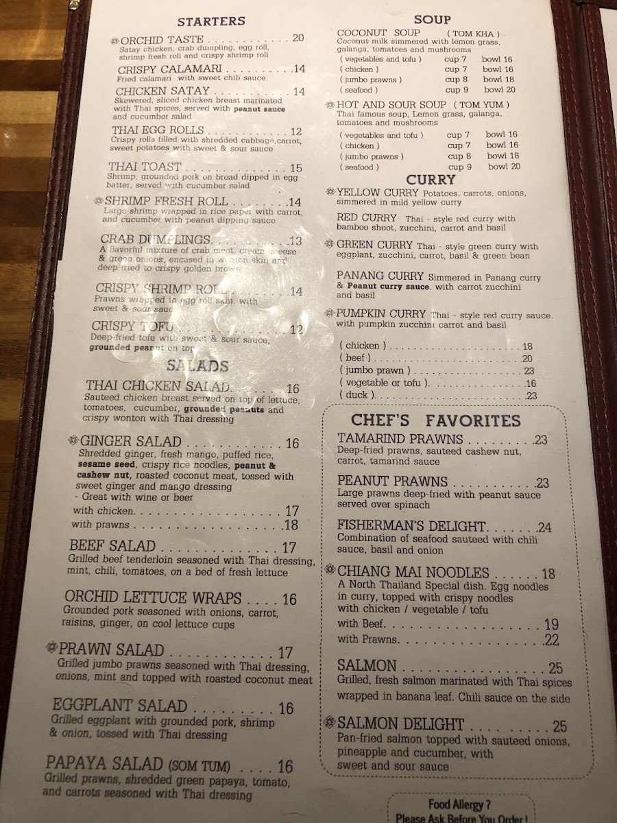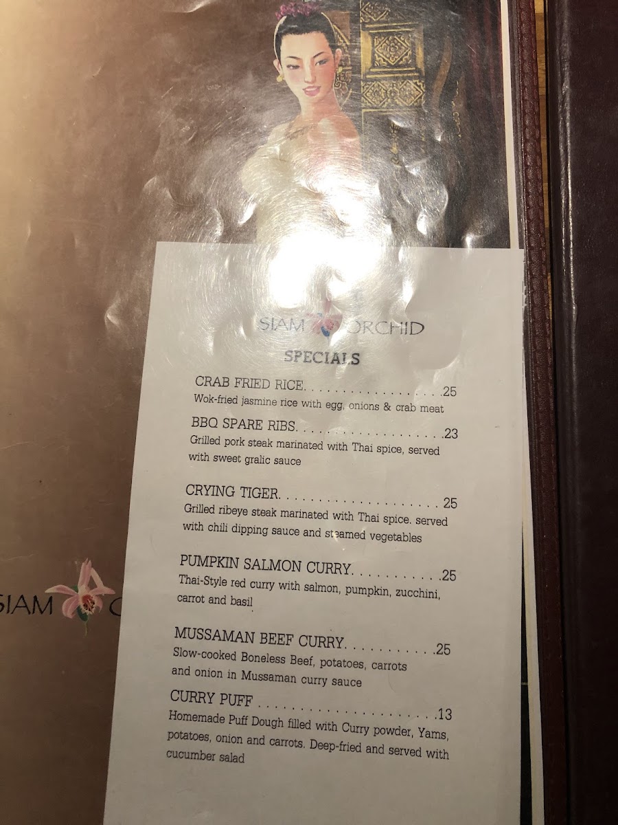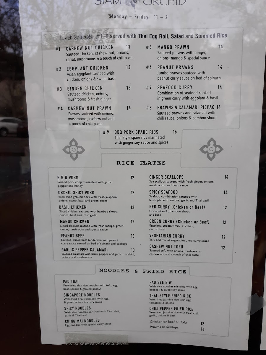 The menu at Siam Orchid Thai Restaurant offers a wide variety of traditional Thai dishes, catering to all tastes. For meat lovers, options like BBQ Pork, Spicy Pork, and Peanut Beef are available, along with unique choices like Jalapeno Beef and Cashew Nut Chicken. Seafood enthusiasts will enjoy dishes such as Cashew Nut Prawn, Garlic Pepper Calamari, and Spicy Seafood. Vegetarians can indulge in Mixed Vegetables, Pra Rama Pak, and Spicy Tofu. The fried rice and noodle selections include popular options like Thai-Style Fried Rice, Orchid Fried Rice, and Singapore Noodles. For those looking for a refreshing drink, the restaurant serves Thai Iced Tea, Lemonade, and San Pellegrino. Desserts like Sticky Rice with Fresh Mango and Fried Banana with Coconut Ice Cream offer a sweet finish to the meal. The side dishes, including Cucumber Salad and Steamed Jasmine Rice, complement the main courses. For a truly flavorful experience, diners can also explore specialties like Crying Tiger and Pumpkin Salmon Curry. With such a diverse menu, Siam Orchid provides something for everyone, making it a great choice for any occasion.